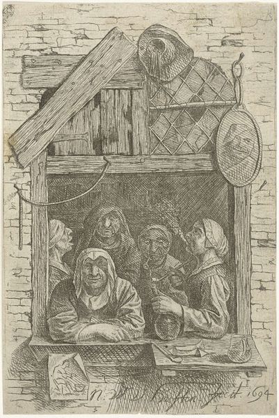 Nicolas van Haften created 'Three Smokers at a Window' with pen and brown ink, presenting a scene dominated by architectural forms and human figures closely intertwined. The composition emphasizes the window's structure, framing three smokers in a tightly packed space. Haften uses line and texture to distinguish between the solidity of the brickwork and the soft human forms. The contrast between the rigid window frame and the languid poses of the figures creates a visual tension, suggesting a breakdown of societal norms. This drawing reflects a broader cultural fascination with lower-class life during the period, but the artist uses the window as a structural device. The window is not only a literal opening, but also as a frame that invites reflection. The work destabilizes conventional artistic values. The seemingly simple, observational drawing encourages us to re-evaluate our notions of order and disorder, inviting us to reconsider the boundaries of human perception.