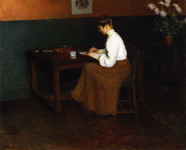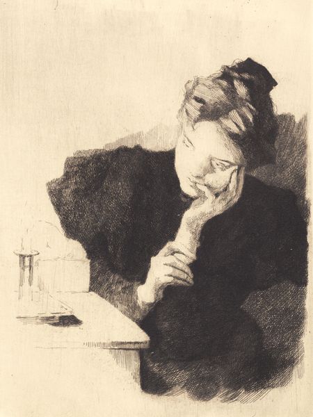 Editor: Here we have Marie Bashkirtseff's "At a Book", a self-portrait executed in oil paint, with an impasto technique. It feels intensely introspective. I'm struck by the dark background that seems to push the figure forward. How do you interpret this work? Curator: For me, this work raises questions about the very act of artistic production, its materials and labor. Note the texture, the thick application of paint – it calls attention to its constructed nature. It isn't simply a window into the artist's soul. How does the materiality of the oil paint contribute to the sense of "intense introspection" you identified? Editor: Well, the texture, the impasto... It makes it feel less idealized, more grounded, perhaps? Like we're seeing the physical act of creation as much as the inner world. It isn't this kind of art what makes the process visible and tangible? Curator: Exactly. And what of the book? Its pages are blurred, illegible. Consider its social context. As a female artist, Bashkirtseff had limited access to formal training, and limited possibilities for women during that time. Does this work then present also a struggle between intellectuality and a societal-defined role of women? How did Bashkirtseff overcome that barrier by working with new means of production and diffusion for her art? Editor: That’s a compelling point. Perhaps the blurred pages represent restricted access to knowledge. In some way, painting may have provided Bashkirtseff an occupation for something intellectual. Curator: Precisely. Now let us think in how academic art helped Bashkirtseff explore topics more comfortably than with realistic approaches... And, ultimately, it forces us to think about who has access to create and to represent themselves. Editor: That changes how I see it entirely. The materials and even the illegible book are all part of a bigger story. Curator: Yes. Thinking about art's creation shifts our attention from the singular genius of the artist to the broader structures that shape both its making and its meaning.