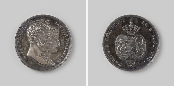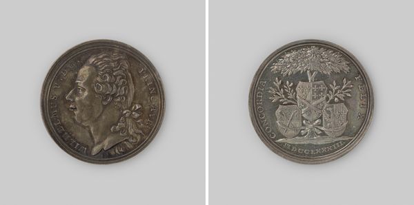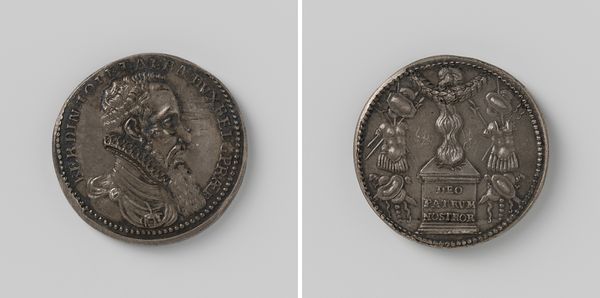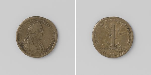 Editor: Here we have "Burning of the Dutch fleet near Tobago," created in 1677 out of metal by Anton Meybusch. It’s a rather small object, but the scenes and portrait are rendered with striking clarity. What do you make of its imagery? Curator: The image bears powerful symbols from its era. Do you see how the portrait of the king dominates one side, conveying authority, legitimacy? This face and the inscription are not simply identification; it is a statement about power, resonating with the concept of divine right of kings. And opposite, on the reverse side of this medal? Editor: I see a winged figure, like an angel or Victory, surrounded by what looks like smoke or flames. Is this tied to a specific victory? Curator: Exactly. The Dutch fleet’s burning near Tobago represents a significant historical moment, immortalized in visual language. Notice how fire, historically linked to destruction but also purification, consumes the ships. Victory stands triumphant, but over a scene of devastation. How might contemporaries interpret such contrasting symbols? Editor: Perhaps that even in destruction, there's a claim of triumph, a symbolic 'burning away' of opposition. Almost like alchemy, but with nations. Curator: A fascinating comparison. It is crucial to realize that symbols work on multiple layers. Religious and political ideals permeate this piece, revealing much about the collective mindset of the time, a cultural memory. Think of these potent symbols being passed from hand to hand… Editor: I hadn't considered it as a cultural memory object. The way the symbols condense such complex political messages for posterity, that's quite impactful. Curator: Indeed. What you see in its surface tells larger narratives.
