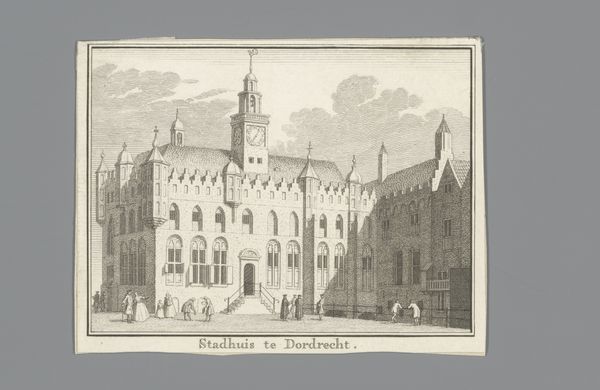 Curator: Welcome. We're standing before Carel Frederik Bendorp's "Gezicht op het Gravensteen te Leiden," an etching and engraving likely made between 1786 and 1792. It's a cityscape view of the Gravensteen castle in Leiden. Editor: My first thought? It feels…rigid. The lines are so controlled, and the composition is meticulously balanced. Even the clouds seem to obey a certain order. Curator: That orderliness aligns with Neoclassicism, an art movement emphasizing reason and symmetry. The late 18th century was a time of enlightenment ideals, and art often reflected a desire for structure and moral clarity in the face of social upheaval. Editor: You can really see it in the execution—the clean lines of the architecture and the careful details in the stonework. The material process highlights precision above all else. It's fascinating how the very act of etching and engraving reinforces the values of the time. Curator: Absolutely. Notice, too, how the artist carefully positions figures within the scene. They’re not merely there to fill space; they add a sense of scale and human presence to the architecture, emphasizing civic life. This wasn’t just about recording buildings. It was about showing Leiden as a thriving center. Editor: Though those tiny figures also feel…somewhat detached, no? Like props in this carefully staged urban theatre. I wonder how many prints like this Bendorp produced, feeding this image of civic pride to the growing middle class? Curator: Such prints played a significant role in shaping civic identity. They served almost as early forms of propaganda, promoting a sense of community and shared history within Leiden and beyond. Editor: And the labour involved. The skill and time necessary to produce the copper plate for printing, all those individual lines etched one by one, reproduced over and over to reinforce Leiden’s importance as a centre of trade and commerce. Amazing! Curator: Yes, we can read it as both an aesthetic statement and a political tool, reflective of its time. Editor: It's a stark reminder of how much intent can be embedded in a seemingly simple cityscape. Curator: A fitting way to consider how art reflects and shapes its world. Editor: Indeed! Seeing this makes me appreciate just how loaded every material choice and process can be.