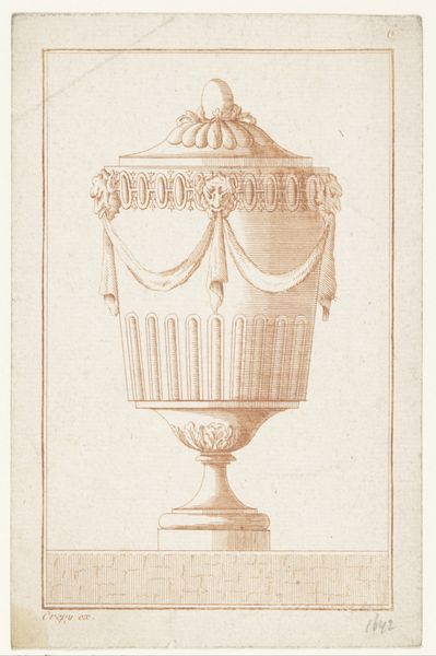Editor: This is "Neoklassieke vaas met draperie," a drawing dating back to the late 18th century by P. Moithey. It depicts a vase, meticulously rendered in ink and engraving. It feels incredibly formal and idealized, almost oppressively so. How do you interpret this work? Curator: Oppressive is an interesting word choice. Consider the context. This piece is deeply embedded in Neoclassicism, a movement that deliberately harked back to ancient Greece and Rome. This wasn't merely aesthetic; it was a statement. It stood in stark opposition to the decadence of the Rococo that came before, aligning itself with ideals of civic virtue, order, and reason during a period of immense social and political upheaval. Can you see that reflected in the composition? Editor: I think so, yes. The symmetry and clean lines definitely convey that sense of order. But the drapery… is it meant to soften that rigidity? Curator: Perhaps. Or it might serve to subtly underline the power dynamics at play. Drapery in art is rarely just decorative. It can be used to conceal, to reveal, to denote status, to emphasize the body beneath, or even, in this context, allude to classical sculpture. Who benefits from this order? Who is excluded? Editor: I hadn’t thought about it that way. So the vase, while seemingly just a decorative object, becomes a symbol of power structures and societal values. Curator: Precisely. Neoclassicism, while championing reason, often ignored or suppressed marginalized voices. Reflect on how such visual expressions become tools in shaping a collective consciousness, one that reinforces particular socio-political positions. How does recognizing that context shift your perspective? Editor: It completely changes it! It's no longer just a pretty drawing of a vase, but a window into the complex power dynamics of the time. I see the need to question whose ideals are being represented. Curator: Exactly! Art, even in its most decorative form, is always a product of its time. Questioning its intended, and unintended, effects, opens up new understandings of art history.