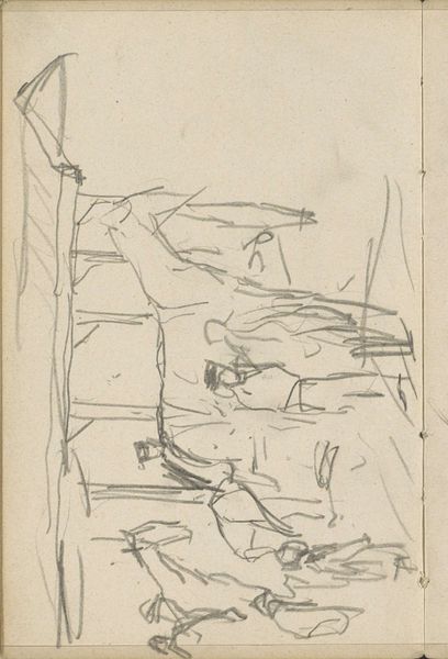 Curator: This is George Hendrik Breitner’s sketch titled "Zittende figuren in een etablissement," dating back to the 1910s and held here at the Rijksmuseum. What catches your eye initially? Editor: There's an immediacy to it, a rawness. It feels like a fleeting moment captured in frantic lines, all pencil on paper. The composition is quite fragmented; a struggle, perhaps. Curator: Exactly. Think about Breitner’s milieu—late 19th, early 20th century Amsterdam. He was deeply engaged with depicting the lives of working-class people, often frequenting places like these. This sketch gives us access to his artistic process and maybe an actual site of working class interactions. It probably gave form to the later paintings which made it into the commercial world and public conciousness. Editor: So, this sketchbook is a witness, not just an artwork? How does this material connection affect what we see on the surface? I notice the angular forms, the repeated lines suggesting movement or perhaps uncertainty. The light seems captured by the contrast of deep strokes, highlighting how light hits the interior surfaces. Curator: It reveals his intense study of figures in casual poses and his interest in working people at leisure. Notice how the artist chose pencil lines and sketching. The figures aren’t idealized or posed. What were their material conditions that impacted Breitner as he chose his subjects and locations? The labor of sitting or not working becomes visualized. Editor: Interesting. Viewing this as a kind of historical documentation—you almost expect the smells, noises of an old bar or coffeehouse to waft from the sketch itself. It appears less a polished depiction and more an impression, an unrefined vision. Curator: And it asks, who are they beyond their depiction. As such, the sketch isn't simply about aesthetic formalism; rather, the image represents labor relations that can be observed at the time it was made and the role an artist like Breitner plays in this depiction. How would one’s class define one’s ability to engage with such drawings as these? Who could afford these works and who could not? Editor: That adds another layer—Breitner capturing not just an image but also a moment laden with social context. Curator: Indeed. Reflecting on this drawing, the quick strokes become less chaotic, more deliberate—recording aspects of urban working-class experiences during a specific timeframe in the Netherlands. Editor: Yes, it’s fascinating how close examination teases out greater context, beyond the strokes themselves, leading to something much larger and more potent.
