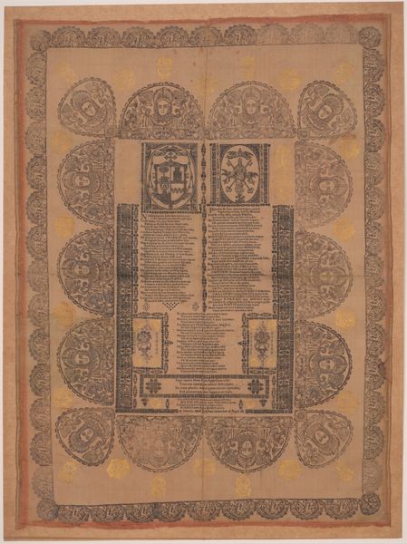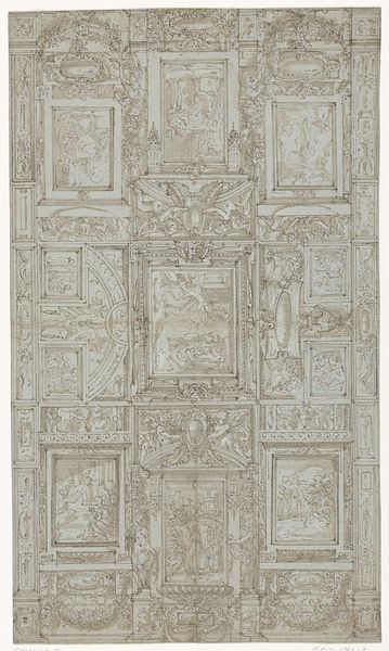 Curator: Immediately, the symmetry is striking. It's so formal, so… reserved, wouldn't you say? Editor: Precisely! And we see that rigorous order in "Design for a Decorative Panel" by Jean Démosthène Dugourc, likely conceived between 1787 and 1808. Curator: Ah, a design. So not just a pretty picture. A blueprint for some grand salon then? Those precise engravings must've been crucial. I love that this captures potential, not a fait accompli. Editor: Indeed. Notice how the artist employs allegory through carefully placed classical figures and motifs. Observe, for instance, the central figure, likely a representation of abundance, or perhaps civilization itself, enthroned upon a globe, flanked by lesser deities. Curator: Gods on globes! Talk about your worldviews. But really, it's a celebration of structure and control. Almost intimidating, but there’s a grace here, in the balance of dark and light… it invites curiosity, makes you want to trace every line. Editor: Precisely, the linear precision of Dugourc’s work typifies Neoclassical aesthetics. The very restraint in color—limited shades in this drawing, reflects the Enlightenment’s emphasis on reason. Also notice the sphinxes… quite fashionable at the time! Curator: Sphinxes, gods, and geometrical patterns… it's an entire mood board in one drawing. Knowing this would hang as a panel, informs how to experience the object and informs its Neoclassical structure, which you point out... Do you feel that structure speaks for its time? I mean... the artist's choices reflect then, no? Editor: Yes! A closer inspection also reveals a mastery of visual organization where various iconographic schemes articulate philosophical ideals of beauty, order, and historical continuity so cherished during the late 18th and early 19th centuries. And I suppose a longing for continuity amidst growing change. Curator: Well, you have made me ponder over Dugourc's design! Its cool formalism and controlled aesthetics perhaps hold keys to understanding more tumultuous historical tides than one initially suspects. Editor: A fascinating exploration into design—a reminder of how even intended "decorative" objects can yield such thought provoking encounters across the ages.