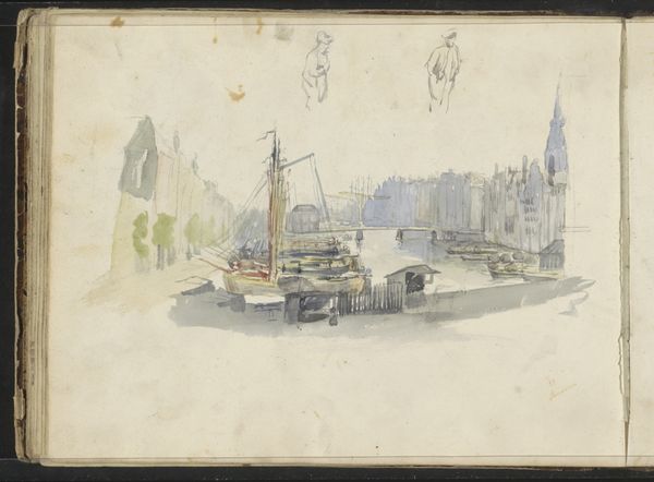 Curator: Standing before us, we have a drawing titled "Kanal mit Schleusentor, links kehrt eine Magd die Straße," which translates to "Canal with a Lock Gate, a Maid Sweeping the Street on the Left." It is crafted with ink and watercolor on paper, attributed to Johannes Huibert Prins. Editor: My initial reaction is that it's rather subdued in palette, almost faded, yet possesses a tranquil atmosphere. There’s a definite sense of everyday life unfolding; the reflections in the water add an intriguing depth. Curator: Indeed. The materials are significant here. Prins’s choice of ink and watercolor allows for a delicate portrayal of the urban landscape, typical of cityscape genre paintings of that era. One can appreciate how he manages to capture a moment through quite common material. The use of paper gives a light feel for the rendering, while requiring greater artisanal mastery for ink or watercolor use, doesn’t it? Editor: Absolutely. It's important to note the social dynamics hinted at within the scene. We see a woman performing manual labor – sweeping – in the foreground. How might her presence comment on gender roles and the social hierarchy within this urban environment? The architecture versus labour contrasts a kind of "cityscape within social life", wouldn’t you agree? Curator: An interesting consideration. The lock gate, though functional, also symbolizes a kind of controlled flow—paralleling perhaps, the regulated lives of the citizens depicted. This points to the burgeoning development of Amsterdam and a rising merchant class with the rise of Baroque aesthetic and style itself. We can appreciate both technical mastery of applying the media and witness of daily, working-class urban life at the same time. Editor: Considering the historical context is also crucial, particularly looking through the lens of gender. Who is represented, and whose stories remain untold, is a matter to consider, while seeing a tranquil moment frozen on a paper sheet. We can assume and suggest that there could have been other representations depicting more dominant social figures and leave that up for visitors to further debate? Curator: A wonderful point. It forces us to consider what wasn't chosen to be depicted. I appreciate how analyzing this cityscape offers a glimpse into 18th-century urban life through common materials such as paper and ink wash. Editor: Precisely! It underscores the role art plays in negotiating class structures and identities and reveals historical urban fabric for the modern-day public. A wonderful combination, after all.