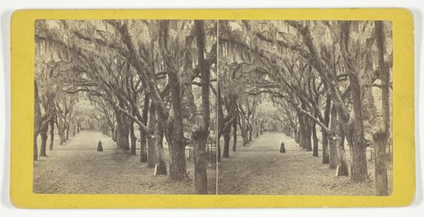 This stereograph, "Bull St. from Madison Square" by J. N. Wilson, presents two nearly identical photographic images side by side. The sepia tones and meticulous composition evoke a sense of serenity, drawing the eye down a tree-lined avenue. The artist uses the stereoscopic format to create an illusion of depth, pulling the viewer into the scene. The repetition of vertical tree trunks acts as a structural frame, while the receding pathway and buildings establish a clear perspective. The stark contrast between light and shadow emphasizes the photograph's formal qualities. Wilson was working in a time when photography was being used as a scientific tool but also as a form of artistic expression. The use of stereoscopic techniques suggests an attempt to capture a more "objective" and immersive reality. Yet, the careful arrangement of elements within the frame also reveals a desire to impose order onto the natural environment. This interplay between objectivity and artistic intervention raises questions about how we perceive and represent space.