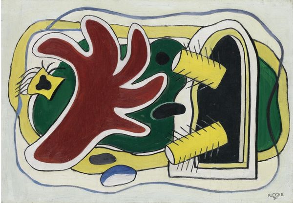 Editor: This is Fernand Léger’s "Fleurs et Dominos," painted in 1950 with oil paint. The title translates to “Flowers and Dominos," which is exactly what you see. It's… striking. The stark outlines and contrasting colors are very bold. What do you see in this piece? Curator: The piece offers an engaging study of Léger's late-career formalism. Observe how he reduces natural and man-made forms—flowers and dominoes—to basic geometric shapes. The contrast in subject is intriguing, wouldn't you say? Editor: I see what you mean. He almost flattens the objects and eliminates traditional perspective. But what’s the effect of putting the natural alongside the artificial like this? Curator: Precisely. Note the interplay between organic and geometric shapes. Léger balances the curvilinear forms of the flowers against the sharp-edged dominoes. The strong lines serve to compartmentalize each object within the piece. Ask yourself: does this speak to the mechanization of modern life? Editor: It does create that sense of a machine-like construction…everything is so carefully delineated. Is the emotional impact intended? It feels quite neutral to me, devoid of sentimental feelings despite depicting flowers. Curator: Léger is less interested in emotional expression than in exploring the formal relationships between shapes and colors. It is about the inherent aesthetic quality of these formal structures. Would you say that each distinct segment could function independently while also contributing to a collective form? Editor: Yes, I do see that. Viewing it purely in terms of shapes, colours, and construction helps appreciate what Léger achieves in "Fleurs et Dominos." Curator: Indeed. The dialogue between these geometric and figurative shapes create both harmony and tension. Editor: I’ve definitely got a new appreciation for how much can be said through purely formal elements. Thanks!
