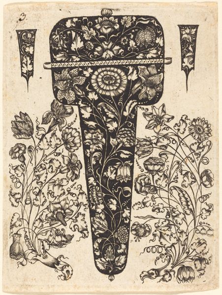 Editor: Here we have a fifteenth-century "Panel of Ornament" – "Schr. 2006m" as it's called – an anonymous work combining drawing, watercolor and ink on paper, housed here at the Met. It strikes me as a rather curious and almost playful piece. What are your initial thoughts, looking at this work? Curator: Playful indeed. But let’s also consider the broader context: medieval society, deeply structured by hierarchy and religion. Ornament wasn't mere decoration; it was a visual language. Does the duality of design here, with its human-like face versus the geometric shapes, echo the tensions of that era? Consider the mask, could it represent marginalized voices or the anxieties of the period? Editor: That's a fascinating point! I hadn't considered it as a reflection of societal tensions, I was just enjoying the image as I saw it! Could you expand a little more? Curator: Think about the role of the artist. Why would they choose ornament, a seemingly "minor" art form? Could it be a subtle act of resistance, a way to express ideas outside the dominant narratives of religious or aristocratic art? The ink drawings, the floral watercolors... are they echoing the voices, silenced perhaps elsewhere, here claiming visibility in the texture and detail? Who was allowed to produce, sell or own these images? Editor: So you see the artwork existing within a wider framework, using its small scale almost as a strength? Curator: Precisely. And what if we read the naturalistic elements – the flowers, the leaves – through a feminist lens? Are they symbols of fertility, life, a celebration of the feminine in a patriarchal world? Editor: I never thought a decorative panel could contain such layers. I came expecting simple beauty. Curator: And there is beauty, but it’s beauty interwoven with history, power, and the quiet voices of a distant time. Seeing art, is so often also about how we interpret the surrounding social structures, class relations, and politics.