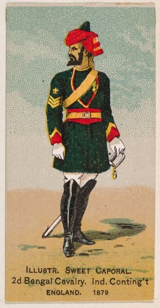 This image shows an Austrian Gendarme of the Guard from 1850 and it was made by Kinney Brothers Tobacco Company as an advertisement for Sweet Caporal Cigarettes. The image is part of a Military Series that creates meaning through visual codes, cultural references, and historical associations. In mid-nineteenth-century Austria, the Gendarmerie were responsible for maintaining public order, especially in rural areas. The figure's uniform, complete with elaborate headdress and sword, signifies power and authority, reflecting the conservative social structures of the time. The distribution of these cards was, in itself, an exercise of power by the Kinney Brothers, a commercial enterprise whose wealth depended upon a global system of production and distribution. To understand the image more fully, we might research the history of Austrian law enforcement, the fashion of military uniforms, and the development of the modern advertising industry. Considering these social and institutional contexts allows us to better interpret the imagery and its wider cultural significance.