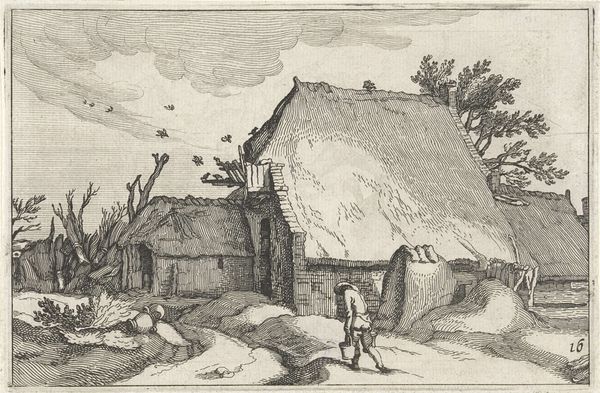 Claes Jansz. Visscher created this print, "Farmhouse with Collapsed Reed Roof," around the early 17th century. The eye is immediately drawn to the dilapidated structure, where the heavy thatched roof seems to merge with the very ground it stands on. Visscher's use of etching brings out a remarkable density of line, a technique that defines the textures of both the natural and built environment. Notice how the roof's collapse isn't just a depiction of decay, but an exploration of form and material. The thatched roof is not simply a covering, but a textured surface that interacts with light and shadow. This creates a sense of volume that challenges our understanding of architectural stability. The rural setting and everyday figures are coded in a visual language that speaks to broader themes of nature, time, and the poetics of decline. Visscher presents us with a visual puzzle that reflects the transient nature of existence.