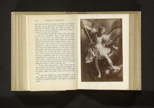 Editor: Here we have what is called "Fotoreproductie van een schilderij van de aartsengel Michael door Guido Reni," a photograph, specifically a gelatin-silver print, dating from before 1860. It appears to be an image within an open book. The picture itself has Baroque style, but what is especially compelling to me is the layered effect that combines printed text and an image of a painting on aged paper. What catches your eye, and how do you interpret this combination of media? Curator: It's fascinating how photography is used here, not as a primary artwork, but as a reproduction. This touches on issues of accessibility and the democratization of art. Guido Reni’s original painting, steeped in Baroque aesthetics and religious symbolism, was likely only available to a privileged few. But this photograph, reproduced in a book, made the image more widely available, shifting its cultural meaning. How does the context change the understanding of power? Does the photographic reproduction challenge the authority of the original artwork, or does it reinforce it by making it accessible? Editor: That's a great point! It's easy to overlook the radical implications of photographic reproduction. The book presents the photograph alongside text...so the image becomes enmeshed with narrative. Curator: Exactly! And who is this narrative serving? What societal values does the book propagate? Considering the date, pre-1860, and the religious subject matter, this reproduction likely functioned as a tool for reinforcing religious ideology and social order. The figure of Michael defeating the devil reinforces a binary view of good versus evil, one that might have been used to justify various forms of oppression or exclusion. Editor: So, beyond aesthetic appreciation, this image opens up a discussion about the social function of art and how reproductions mediate our understanding of power dynamics. That’s insightful. Curator: Precisely! And it compels us to question how images are always embedded within larger cultural narratives. That is what art should do: force the questions society fears the most.