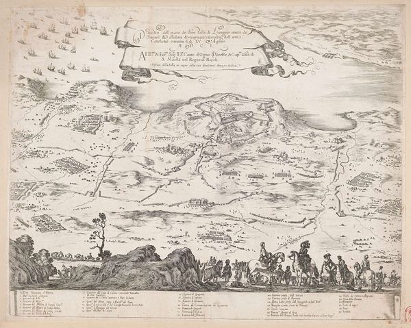 Stefano della Bella made this print, Beleg van Piombino, using etching, a printmaking technique that dates back to the early 16th century. The process involves coating a metal plate with a waxy, acid-resistant substance, and then drawing through this coating with a sharp needle. When the plate is immersed in acid, the exposed lines are eaten away, creating grooves that hold ink. In this particular print, the fineness of the etched lines gives a sense of precision, appropriate for the subject matter: a military engagement. Della Bella used the technique to map out every detail of the siege, emphasizing the strategic and logistical work of warfare. Consider the many hands involved. From the miners extracting metal, to the specialists preparing the etching ground and acid, to the press operators who transferred the image to paper, labor is embedded at every stage of production. This print speaks to the collective effort that underlies both art and war.