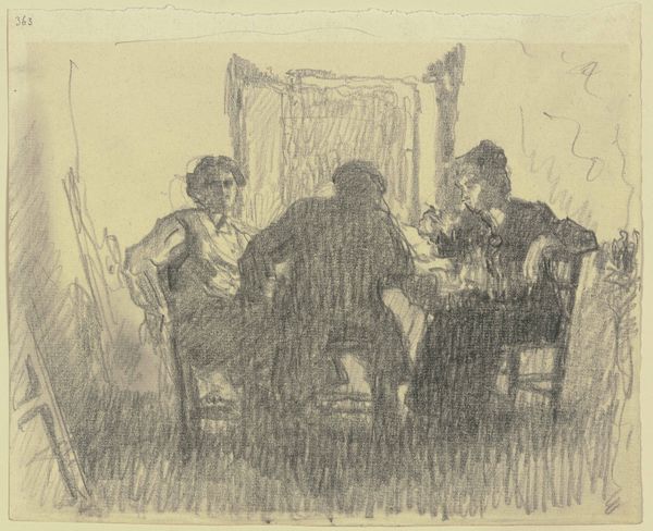 Herman Moerkerk made this drawing, called "Theekransje," with graphite and colored pencil. The title is Dutch, and it translates to "tea party" in English. Looking at this work, one wonders what sort of social dynamics are at play in this scene, which seems to depict affluent women gathered for tea, perhaps in the Netherlands? The fashions indicate a date in the early twentieth century. The hats with feathers and elaborate trimming, the high-necked dresses, and the covered hair all speak to the codes of bourgeois femininity in Europe at that time. The artist has shown the women from the back, turning them away from our gaze. This could be read as a critique of this social set, and the drawing emphasizes a sort of conformity or homogeneity in their appearance. To understand this work better, we might look at other examples of Moerkerk's drawings and paintings, as well as social histories of Dutch culture in this period. What emerges is that "Theekransje" can be read as a social commentary on the rituals of middle-class life.