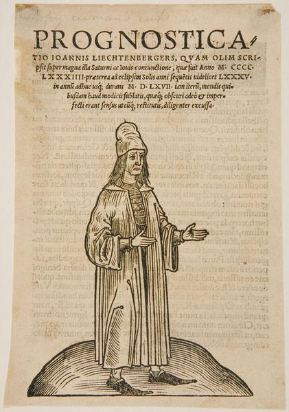 Curator: This is Illustration XXVI, by an anonymous artist. The piece currently resides here at the Harvard Art Museums. Editor: There's a somber weight to the figure—a sense of quiet authority emanating from those stark lines. Curator: Absolutely. The linear woodcut technique itself speaks to a specific historical context, one where the material conditions of printing shaped the visual language of disseminating knowledge. Editor: And that robe! The labor involved in creating or even just obtaining such garments must have been considerable. The rosary also has its own form of material significance. Curator: Precisely. These visual cues aren't just about status but also about the intersections of power, religion, and identity in the depicted society. The male figure’s identity is linked to a social-political role. Editor: It makes me think about the physical act of carving this block, the repetitive gesture and the skill. How much it reflects the work of many hands. Curator: By understanding these intersections of history, labor, and form, we can better address the present and futures in which art functions. Editor: I agree. Considering these historical works really contextualizes our current methods of art-making and material consumption.