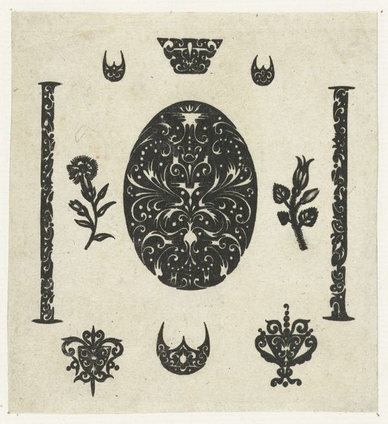 Editor: Here we have “Ornament” by Master AD. It seems to be an engraving or print of some sort, with really intricate geometric and floral-like patterns. There is so much fine detail in this small work. How does the composition and the play of line work contribute to the overall aesthetic, in your opinion? Curator: Observe the artist’s control of line and form; how they interlock to create a dense but balanced composition. Note the distribution of positive and negative space. Do you find a hierarchy within the design? Is there a focal point to which the eye is immediately drawn, or is the viewer's gaze meant to wander across the whole surface? Editor: It seems fairly symmetrical; my eye moves across the entirety of it pretty evenly. Is that purposeful, to deny a visual hierarchy? Curator: The symmetrical arrangement could suggest a concern with balance and order. The repetition of motifs—floral scrolls, geometric shapes— establishes a rhythm. Consider the use of black and white. The contrast enhances the details, giving definition and sharpness to the image. It appears there are two different styles between the edges and the medallion; is there a connection to you? Editor: That’s interesting. The columns on the sides feel more rigid and stylized than the round ornament in the center. I think that contrast makes both styles pop, as separate, distinct elements. Curator: Precisely. By examining its formal components – the balance of positive and negative space, the intricacy of line, the symmetry and contrast - we come to appreciate not only its visual appeal but also the artist's masterful manipulation of the graphic language. Editor: I never thought about it in terms of visual language before, but it's amazing how much is conveyed here. Curator: Indeed. These elements structure our understanding and appreciation. Thank you for your valuable perspectives!