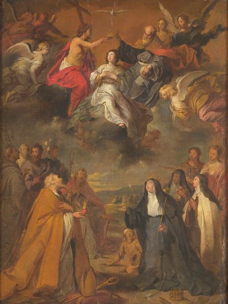 This painting, titled "Stairway to Heaven", is made with oil paint and located at SMK, the Statens Museum for Kunst. The work immediately strikes us with its contrasting registers: an earthly gathering at the bottom and an ethereal ascent towards a heavenly figure at the top. Notice how the muted tones and earthbound figures at the bottom sharply contrast with the radiant, light-filled expanse above, creating a visual hierarchy. The stairway motif, both literal and symbolic, bridges this divide, guiding the viewer's eye upward. In semiotic terms, the upward direction and the increasing brightness act as signs pointing towards transcendence. This can be understood within a historical context, where art often served to reinforce religious narratives and moral codes. The painting visually articulates a pathway to salvation and divine grace. Consider the formal construction of the piece—how the artist employs light, color, and perspective to construct not just an image, but an invitation into a specific worldview. Art doesn't simply reflect reality; it actively shapes our perceptions and beliefs.