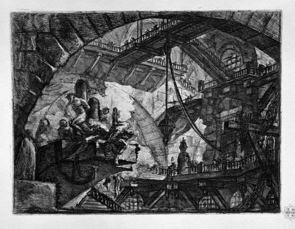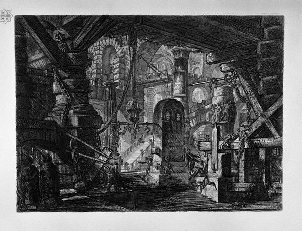 Giovanni Battista Piranesi created “The Staircase with Trophies” using etching, a medium that perfectly captures the drama of light and shadow that defines this work. The image presents a grandiose, cavernous space filled with staircases, bridges, and figures that seem dwarfed by their surroundings. The composition is striking, with Piranesi employing sharp, angular lines to create a sense of depth and perspective that both draws you in and disorients you. The use of dark, heavy shading contrasts with areas of light, heightening the theatrical feel and creating a sense of mystery. Piranesi’s fascination with architectural forms and their potential to overwhelm the human figure suggests a commentary on the sublime—where awe and terror coexist. The staircase becomes a metaphor for the labyrinthine nature of human ambition and the imposing structures of power. Consider how the play of light and shadow, combined with the sheer scale of the architecture, contributes to a disquieting yet captivating experience, inviting endless interpretations about the nature of space, power, and human existence.