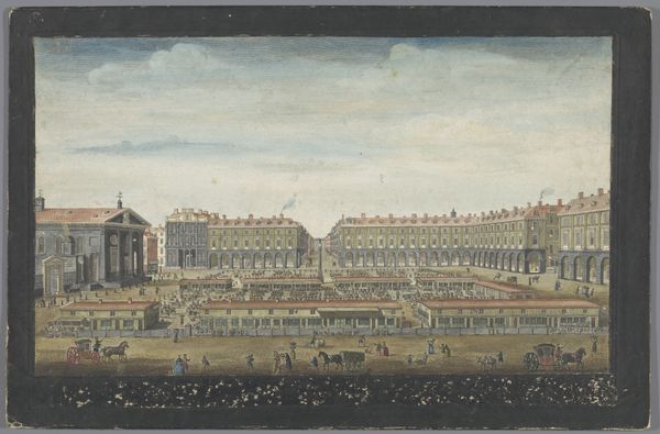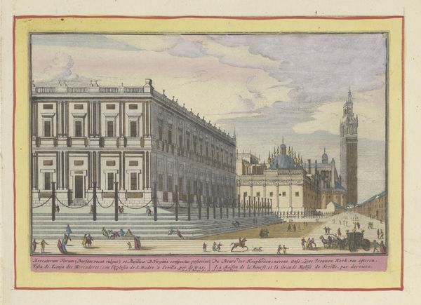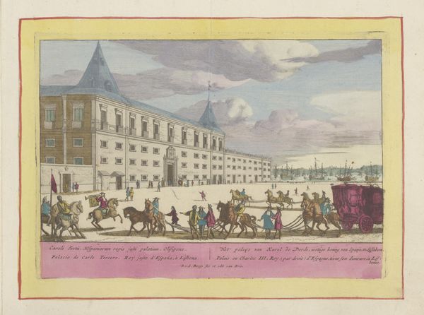 This is Pieter van den Berge's rendering of the Royal Palace in Madrid, a colored etching made around the turn of the 18th century. As an etching, this work began with a metal plate, likely copper. The artist would have coated it with a waxy, acid-resistant ground, then used a sharp needle to scratch away lines, exposing the metal. Immersing the plate in acid would then bite away at these exposed lines, creating grooves. Finally, the plate is inked, the surface wiped clean, and the image transferred to paper under immense pressure. It’s important to consider this process as a kind of industrialized craft. While van den Berge was undoubtedly a skilled draftsman, the etching process allowed for the multiplication of his design. The coloring, likely applied by hand, would have added to the perception of value. This image, therefore, gives us a glimpse not just of a palace, but also the labor and techniques involved in disseminating such views to a wider public. It’s a reminder that even seemingly straightforward images are the result of complex social and economic forces.