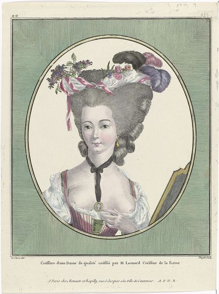 Curator: Immediately striking! The powdered hair, the languid gaze… It’s almost comical in its extravagance, a caricature of aristocratic excess. Editor: I see a potent statement about late 18th-century French society embodied in Pierre Adrien Le Beau's "Gallerie des Modes et Costumes Français, 1781, oo 221: Coeffure nommée à la Lévite…," a watercolor and drawing currently held at the Rijksmuseum. This isn’t simply fashion; it’s a declaration of identity. Curator: Absolutely. The title itself reveals so much. It’s part of a broader series cataloging French fashion, meant to circulate amongst the elite. The 'coiffure' being named highlights how fashion became a spectacle. Hairdressers achieved celebrity status. Editor: And what that "spectacle" reveals is a rigid hierarchy reflected in outward appearance. Note the way the description itself focuses on the hair’s construction, almost like an architectural plan for the upper class. This obsession with presentation masks the anxieties and contradictions of a society teetering on revolution. The sheer volume of hair piled on her head reads like a fragile tower. Curator: True, the Rococo style embraced elaborate ornamentation, yet I see more than just impending doom. I interpret this piece, also, as an intriguing record of daily life in pre-revolution France and its influence on art. How styles traveled through prints like these. It gives us insight into consumption. Editor: I don’t deny that; nonetheless, to ignore the implicit political statement would be a mistake. That elaborate hairstyle needed resources and labor, resources and labor denied to a massive underclass. While aesthetically appealing to some eyes, let’s recognize it for what it truly is: a representation of radical social inequity on the verge of implosion. Curator: Fair enough. Even within the artistic constraints of Rococo, it is hard to turn a blind eye to the fact the woman becomes more ornamentation than a person; less body and more presentation of persona. Editor: Yes, precisely, let's leave our audience to consider its layered message with that in mind.