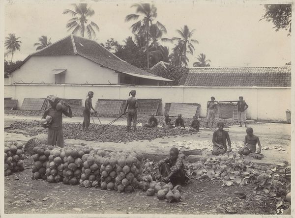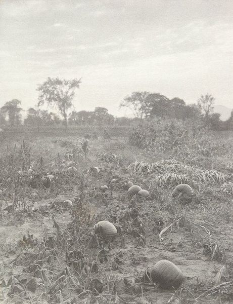 Curator: This photograph, "Setting out a Coffee Plantation at Antigua de Guatemala", is attributed to Eadweard Muybridge and was likely taken between 1875 and 1877. It's an albumen print, possibly a photomontage, and part of a larger series of landscape and genre scenes. Editor: The first thing that strikes me is the scale and texture. The landscape feels raw, almost brutal with all that upturned earth. And there are so many people spread across that hillside – their labor really imprints on the landscape itself. Curator: Absolutely. Muybridge was commissioned to document the expanding infrastructure and industry in Guatemala. This image isn't just a landscape, it's a document of colonial economics, illustrating the transformation of the land for commodity production, with clear social ramifications. Editor: And the medium, the albumen print, speaks volumes. It's a chemical process. Silver is literally pulled from the earth to create this representation of the earth being transformed by labor. The connection between extraction, image making, and exploitation is very striking. Curator: Indeed. Consider the position of the workers—mostly Indigenous Guatemalans. Their relationship to the land has been fundamentally altered by colonial structures, represented in this staged composition which speaks to themes of power and dispossession within photography’s historical narrative. Editor: It makes me wonder about the individual actions of planting these crops, and the skill needed. I see it being hard manual work. Are these techniques or species specific to this plantation or imported as well? What stories do these materials tell? Curator: These images would have circulated within elite circles in Guatemala and abroad, reinforcing colonial power structures and romanticising this form of exploitation. Editor: So this becomes not just a visual document but also a tool for promoting economic and ideological narratives related to labor, colonial expansion, and the global trade of this crop. Curator: Precisely. Muybridge's lens captured more than just a coffee plantation. It reveals the intersection of colonialism, landscape, and labor shaping Guatemalan history. Editor: Understanding those intersections allows us to deconstruct both the romantic idealism that these kinds of pictures convey, while reflecting on the back breaking materials that compose it, to build a greater political narrative.