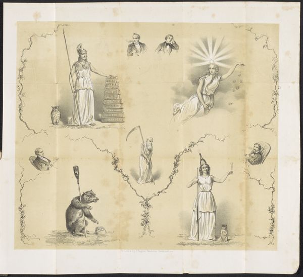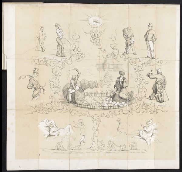 This is a print made in 1855 by Abraham Henricus de Balbian Verster for the Leiden student almanac. It presents a series of humorous vignettes, likely depicting the escapades and misadventures of student life. Looking at the image, we can interpret the artist’s visual codes and cultural references in relation to the social and institutional context of the time. Consider the position of Leiden University, the oldest in the Netherlands, and the role of student culture in shaping social norms. The scenes depicted – pranks, drinking, and encounters with danger – could be a commentary on the privileges and excesses associated with student life in mid-19th century Netherlands. Is the artist celebrating or critiquing these behaviours? Understanding this artwork requires research into the history of student culture, the social hierarchy of Dutch society, and the function of university almanacs as both records and shapers of collective identity. Through historical contextualization, we reveal the complex ways in which art reflects and comments on its contemporary world.