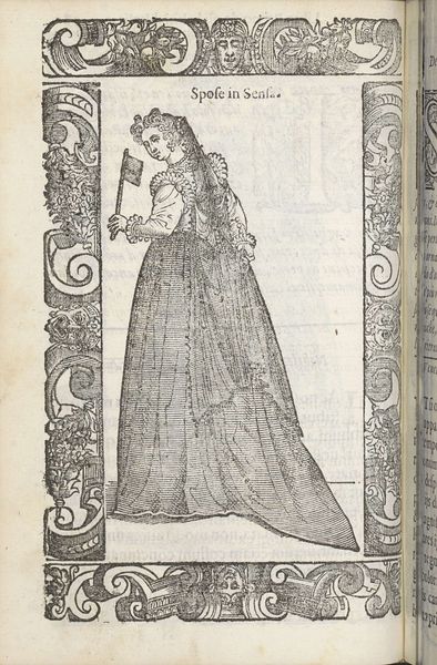 Editor: This is "Vsati in Venetia 1550," an engraving by Christoph Krieger from 1598. It depicts a woman, her form dominated by a large gown and veil. There's a sort of formality to the whole thing, rigid even, wouldn't you say? What story do you think this image is trying to tell? Curator: Story is an interesting word here, I feel a connection to ritual. To me, the beauty here resides in its stark depiction of status, filtered through the engraver's own cultural lens a few decades later. That frame, with all those gargoyle-esque decorations – isn't it delightfully morbid? Like vanity given monstrous form! Do you sense how Krieger's clean lines manage to both define and almost erase the individual woman? Editor: Absolutely! It's like she's being consumed by the visual language of status. And that veil... almost suffocating. Curator: Exactly. Perhaps the woman isn't the subject at all; rather, it's Venetian society’s performance of wealth, codified and, ironically, trapped within the pages of a book. Doesn’t that strike you as just a little…sad? Editor: It does now! I hadn't really considered that it could be a commentary, more than just a portrait. It shows how art can kind of whisper secrets across centuries, doesn’t it? Curator: Precisely! Every line, every shadow hums with intention. The piece serves as a mirror reflecting not only a moment, but our enduring fascination (and often, entanglement) with appearances.