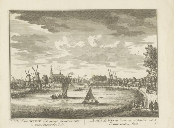 Jan Ruyter's print presents us with Nijmegen as seen from the north. The image offers a scene filled with figures in transit; however, the way the artist depicts the city is especially intriguing. The city itself, crowned with towers and steeples, stands as a beacon of civilization. These vertical elements, piercing the sky, carry echoes of mankind's aspiration toward the divine. Consider the Tower of Babel, an architectural attempt to reach the heavens, representing not only ambition but also the potential for hubris and divine punishment. Note the serene river, a common symbol of life and passage. Boats sail upon it, connecting different realms of existence. It's fascinating how water, often seen in mythology as the source of all life, becomes a pathway for trade and interaction. This echoes ancient myths where rivers are boundaries and bridges between worlds. The entire vista taps into our collective memories, stirring a sense of longing for connection.
