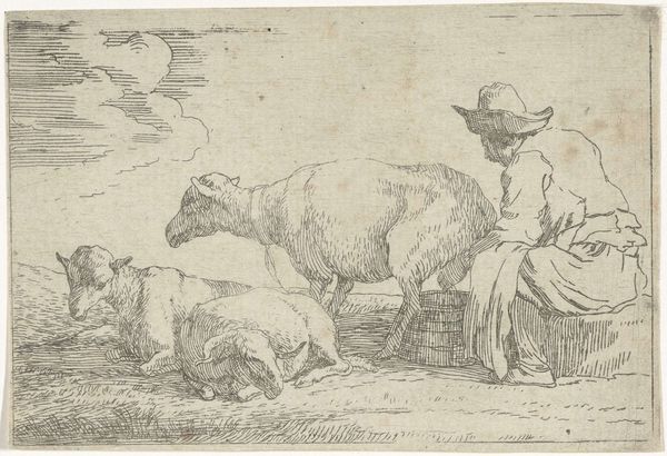 Art Historian: Editor: Here we have "Hunter with his Dogs" by Jan van Ossenbeeck, made sometime between 1647 and 1674. It's an etching, done in ink, and the detail is amazing. The dogs really capture your attention; they look so tired. I'm wondering, what's your take on this piece? Art Historian: I'm immediately drawn to the materiality. Look closely: the lines are etched, presumably into a copper plate, creating these images from manipulated surfaces and the applied labor. The tools, the ink, and the paper used each have their story to tell, offering unique production of an image in early modern Europe. The texture achieved through the hatching technique defines both volume and material surfaces. Do you think the work's original function has any influence? Editor: That's a great point, I was focused on the 'art', I see it now through your perspective. As an etching, was its purpose practical, rather than for show in a gallery? Maybe this image existed originally as an illustration. Art Historian: Precisely. Think about accessibility: prints like these were more readily available and affordable. Images are no longer simply about individual artistic talent or expensive original artworks: reproduction and mass distribution becomes a core function, reaching diverse audiences with differing interests. It suggests a very different relationship to art and its consumption compared to unique paintings. This image hints to both an artistic exploration, but also the early expansion of accessible visual culture through mechanical processes. What do you notice about how Ossenbeeck renders the hunter in comparison to his dogs? Editor: Well, he's actively hunting with some lively dogs in tow, but others are already exhausted; like they’ve been at it for a while. So you could say it is less an image about celebrating the joy of a hunter or heroic depictions but the realities and banalities of labor and toil through animal use. Thanks for offering your thoughts – you have widened my eyes and offered me more insight into it. Art Historian: The pleasure is all mine, and hopefully helps you recognize these critical components present across all artworks.