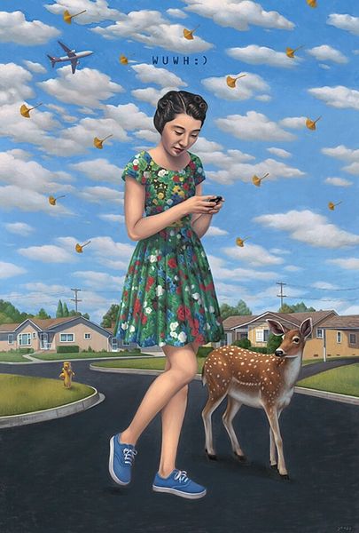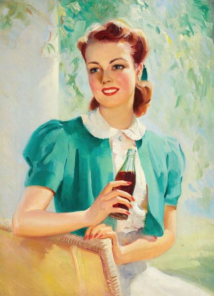 Editor: Here we have “Baked Goods,” an oil painting by Danny Galieote. It presents a woman holding a jar of cookies with this bright, almost unsettling smile. What do you make of it? Curator: Well, right away I’m struck by the light, that intensely bright suburban sun bleaching everything to a kind of heightened reality. The painting screams "idealism" doesn't it? Perfect cookies, perfect smile, even that vintage car looks immaculate. It’s a real snapshot of a constructed… or should I say baked… version of reality. Editor: "Baked version of reality," I love that! Do you think that this idealized presentation has anything to do with, you know, anxieties simmering underneath the surface? Curator: Absolutely! That’s the tension that makes it so compelling. All this striving for perfection is bound to crack somewhere. Take the shadow under her smile—that could hint that the relentless optimism might be masking something else. Plus, isn't that just what we often do, put on a happy face? The painting touches on our own manufactured smiles. It's a reminder that the artifice doesn't always cover it up. Editor: It definitely gives me a lot to chew on, no pun intended! I’ll look at mid-century suburbia differently. Curator: And I'm already craving cookies. It goes to show how even "realistic" art isn't necessarily truthful but reflective. We all create realities to survive.