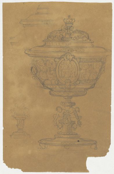 Curator: Standing here, I’m struck by the sheer gravity of the image before us. It’s Charles Percier's rendering from 1804, titled "Ciborium for the Coronation of Napoleon I." You can find it in the Met's collection in New York. Immediately it just looms, this massive chalice sketched out like a phantom idea... Editor: Yes! "Phantom" is the word. There's a ghostly, unreal quality about it. Like it’s a monument floating just out of reach, in that perfect neoclassical greyscale. What a grandly somber feel. Curator: Grandly somber...I think that hits it squarely. I find myself really fixated on its symbolic weight. This object, even as a concept drawing, encapsulates ambition on a frankly absurd scale. Can you see it? How would you feel standing before this artifact in the flesh? Editor: I imagine a mix of awe and a touch of fear. Think about the symbolism; the eagles hinting at Roman authority, the laurel wreaths a classical nod to triumph, all swirling around the central cross. It’s almost pagan and religious at the same time, which…sums up Napoleon's imperial ideology quite neatly, don’t you think? Curator: Indeed. Percier's rendering seems caught between reverie and blueprint. It shows not only a design, but a mood. He so clearly captures this sense of impending… something. Majesty or megalomania, it’s hard to parse which. Editor: Absolutely, and that cross crowning it all... It seems almost precarious atop all that imperial hubris, doesn’t it? Such heavy symbols... do you ever wonder how we continue to carry that much weight as societies? Curator: More than ever. What’s remarkable is how the pencil and print medium soften that intended impact. Imagine the solid, polished version of it during that theatrical coronation—it must have felt stifling! Editor: It probably did. Looking at this preliminary rendering has almost done the opposite for me: all that grandiose meaning begins to evaporate, leaving only the fragile artistry that makes such powerful things even possible. Curator: Ultimately, perhaps the most arresting aspect is not what the ciborium represents, but how vividly Percier lets us glimpse the mechanism behind manufactured glory. Thanks for highlighting that paradox. Editor: My pleasure! That ghostly beauty might be what I carry with me.