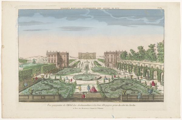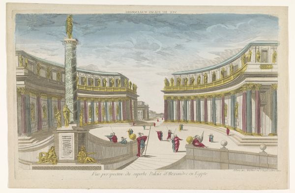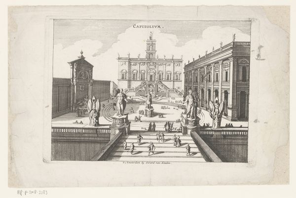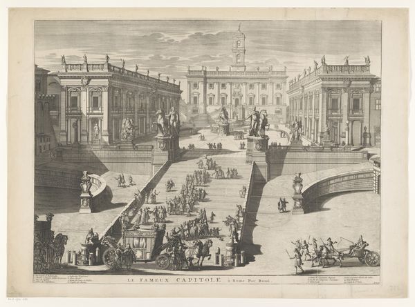 Curator: This is a striking image, isn’t it? What do you make of this "Gezicht op het Capitool te Rome," or View of the Capitoline Hill in Rome, from the 18th century? Editor: Austere. Everything about the rendering of this architectural space speaks of authority and formality. Even the little people are more like carefully positioned pieces on a board than actual figures populating the landscape. Curator: Well, you’ve put your finger on something interesting: authority. The Capitoline Hill has been a symbol of Roman power since antiquity. This image, currently held at the Rijksmuseum, presents it as this perfectly ordered and balanced vision, harking back to the Baroque emphasis on classical ideals and power structures. What is being expressed visually through such emphasis? Editor: I think that visual expression equates to permanence. The rigid perspective, the unyielding symmetry... they create an impression that Rome and its authority are timeless and immutable. This wasn’t just a depiction of a city; it was a statement of Roman resilience at a moment of shifting political powers throughout the 1700s. A perfect image for promoting papal supremacy. Curator: Exactly. The imagery taps into deeply rooted ideas of Rome as the center of civilization and law. The arrangement itself creates an almost mythic space. Consider how the buildings flanking the staircase serve like parentheses or stage wings leading us to the towering Palazzo Senatorio as a narrative. Editor: And those symmetrical staircases almost act like the arms of power, don't they? They lead towards that focal point where secular power resides but with that heavy suggestion of spiritual legitimacy. What I find interesting here, even beyond this statement about lasting dominance, is the almost surreal flatness of it. Curator: Surreal? In what sense? Editor: Everything feels deliberately flattened, the perspective just a touch too formal. It makes the whole scene appear like a meticulously arranged stage set and it speaks volumes about the nature of control—how the city itself is, in effect, a set piece in the theater of Roman dominance, arranged as much to inspire reverence as to project practical power. Curator: A very astute observation! It reveals that visual order isn’t merely aesthetic; it’s a manifestation of ideological order, meant to impress upon the viewer Rome's centrality in the world, as eternal and enduring. Editor: Which leads me to consider, how effective are these declarations through aesthetics today? In a world saturated with diverse ideologies and forms of visual expression, how do historical images like these function—still powerfully, or as beautiful but antique testaments to times long past?