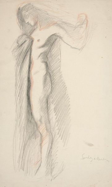 Editor: This is "Sketches of a Boy's Figure for the Painting 'At the Spring'," a pencil drawing by Henryk Siemiradzki, dating from around 1880 to 1885. It's a preparatory sketch, quite delicate. What symbolism do you find embedded within its lines? Curator: This image immediately evokes Arcadia, that pastoral ideal. Even in sketch form, we see a carefully constructed allegory, alluding to innocence and a harmonious relationship with nature. The boy with the flute, the flowing garment... what do they represent to you? Editor: They feel almost staged, like a memory of a classical world, filtered through an idealized lens. Curator: Precisely. Think about the power of the flute itself. Throughout history, it has represented leisure, contemplation, even seduction. In this context, its sound becomes the voice of an imagined past, a constructed paradise. Consider the strategic incompleteness – does it reveal more than a highly rendered painting might? Editor: The incompleteness gives it an air of ethereality; it invites the viewer to co-create the image in their own mind. So it becomes personal as well as historical? Curator: It certainly does. Siemiradzki invites us to partake in a shared cultural memory, reimagining and idealizing a lost world. It is less a true likeness, more a dream of youth, beauty, and simpler times. It taps into that deep human desire for a golden age. Do you sense that nostalgia? Editor: Yes, absolutely. It makes me consider the ways artists use the past to comment on their present. Curator: And how potent visual shorthand can be in shaping our understanding of history and its enduring myths. Editor: It’s amazing how much cultural meaning can be packed into a simple pencil sketch! Curator: Indeed. Even preparatory works can reveal so much about the artist's intentions and the enduring power of symbolic language.