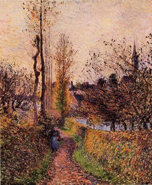 Curator: This is Alfred Sisley's "Near Moret sur Loing," painted in 1881. Editor: The bridge timbers framing the left create a portal effect. The overall atmosphere is muted, serene; yet, there's a latent melancholy to the grayed tones, like a faded memory. Curator: Observe how Sisley manipulates the picture plane through the bridge's structural elements, contrasting its hard edges with the softness of the surrounding landscape. The impasto application captures the ephemeral quality of light, blurring the line between form and atmosphere. Editor: Water often symbolizes purification, reflection, or even the unconscious. The reflection of the buildings suggests a world both present and ethereal. Moret-sur-Loing's church steeples point to heaven; maybe this captures more than just landscape, but humanity’s aspirations. Curator: Indeed, and look closely at the composition: the contrast of geometric and organic forms is key here. Sisley uses subtle variations in hue and tone to differentiate between the foreground, middle ground, and background, constructing depth with deceptively simple means. Note also how he employed plein-air. Editor: It gives it all a powerful sense of immediacy, that feeling of a specific, fleeting moment held captive forever on the canvas. A quiet contemplation along the Loing river, infused with human stories. Curator: A captivating blend of technique and sensitivity from an Impressionist master. Editor: Precisely. One that quietly unfolds its layers the longer you allow yourself to observe.