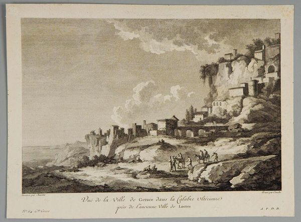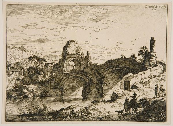 Editor: This is "Reipoldkirchen" by Baron Stephan von Stengel, currently housed at the Harvard Art Museums. It looks like an etching, depicting a rather dilapidated building. What's your take on the scene? Curator: Given Stengel's aristocratic background, such scenes often presented a romanticized view of rural decline, reinforcing a specific socio-political perspective on land ownership and the changing social order. Do you find any idealized elements? Editor: Perhaps the way the clouds are rendered? They seem almost heavenly compared to the ramshackle building. It is interesting how social commentary can seep into the artwork! Curator: Precisely! The seemingly objective depiction is, in fact, deeply embedded in the politics of its time. Considering that allows a richer appreciation.