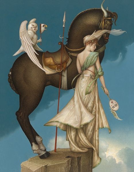 Michael Parkes painted ‘Europa’ using traditional oil paints, which is not unusual, but his artistic practice is uniquely his own. Parkes’s mastery with the oil medium is apparent through the artwork’s smooth, porcelain-like finish. He uses a meticulous glazing technique that involves building up multiple thin layers of paint, resulting in a luminous and ethereal quality. Oil paint’s capacity for blending allows for a seamless transition of colors and tones. Look closely at the figures, and you will notice the delicate gradations in skin tone and the subtle interplay of light and shadow. The details of the swan’s feathers, the water’s reflections, and Europa’s drapery, evidence a high level of craftsmanship and attention to detail. Parkes' choice of oil paints also influences the artwork’s theme. By using a classical medium he reinforces the scene’s ties to traditional European art and mythology. He then destabilizes the tradition by imbuing it with his brand of surreal fantasy, which is tied to non-Western spiritual motifs. It’s a subtle subversion, but one that speaks to the porous borders between high and low art.