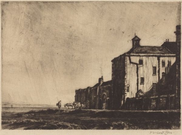Muirhead Bone created this etching, "The Haystack," which presents a study in texture and form, rendered with a delicate yet assertive line. The composition is dominated by the haystack itself, a monumental form whose rough materiality contrasts with the smooth expanse of the sky above. Bone's method involves a dense network of etched lines that model the haystack's volume and surface. This focus on texture and the detailed construction of form lends the artwork a tactile quality; one can almost feel the coarse texture of the straw. The etching technique, with its fine lines and tonal variations, allows Bone to dissect the subject into its essential components, highlighting the play of light and shadow across its surface. The formal elements serve to destabilize any straightforward reading of the artwork as merely pastoral. Instead, Bone employs the haystack as a structure through which we can examine the relationship between organic form and constructed space. The artwork invites a contemplation of how we perceive and interpret the world around us through the lens of artistic representation.