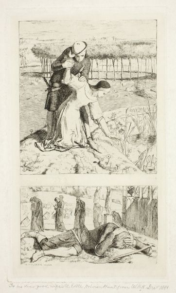 Curator: William Holman Hunt's etching, "Joy and Desolation," presents two contrasting scenes within a single frame. The date inscribed is 1849. Editor: It’s visually stark, almost binary in its presentation of these contrasting experiences. The upper register showing intimate planting, and the lower register showing anguish and suffering. Curator: Hunt meticulously layered etched lines, creating texture that differentiates the figures from their settings, grounding them in recognizable, almost quotidian scenarios. Look closely at the details of their garments. Editor: This speaks to the socio-economic dimensions of emotional expression. The stark contrast invites a narrative reading that intersects with broader issues of class, gender, and even the political turmoil. Curator: Indeed. The materials—the paper and ink—act as a conduit for a Victorian commentary on moral and social divisions. Editor: It's a fascinating lens through which to consider Victorian values, revealing as much about societal anxieties as it does about individual emotion. Curator: Precisely, and this small etching offers a potent material reminder of those values. Editor: It makes me consider its reception within a contemporary framework, as an intimate historical artifact.
