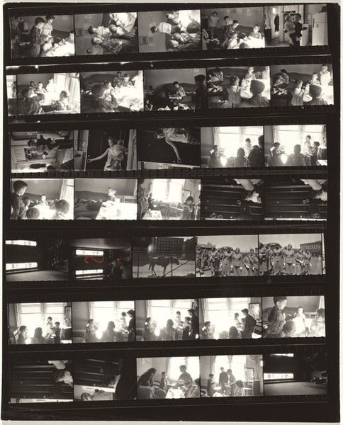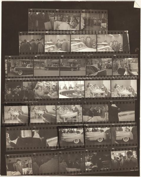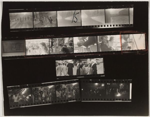 Editor: This is "London 1A," a contact print photograph from 1953 by Robert Frank. Looking at it, I see all these frames together… almost like a memory reel, full of life and people in London. What do you see in this piece? Curator: A fascinating arrangement. Frank is offering us a glimpse into the cultural psyche of London post-war, don’t you think? The contact sheet itself, with its sprocket holes and sequential imagery, speaks to the passage of time and the recording of fleeting moments. Notice the juxtaposition of wealth – the fine cars and formal ceremonies – with everyday life, the birds being fed in the park, the crowds... Editor: So it's like he's intentionally contrasting these elements of society. Why present it as a contact sheet, instead of choosing one image? Curator: Precisely! The choice is deliberate. The contact sheet removes the artist’s singular decisive moment, inviting viewers to construct their own narrative. Think of it as a visual poem composed of interconnected symbols, all speaking to the atmosphere and collective experience of a specific time and place. He gives us the ingredients rather than the finished meal. Editor: So the symbolism is found not only in the images themselves but also in their arrangement and presentation... Curator: Indeed. Each image ripples with historical context; they reflect continuity and social commentary, prompting deeper reflection on cultural memory and identity. Editor: That's incredible, seeing how so many meanings can arise from one piece. I'll never look at a photograph the same way again! Curator: And that's the power of the symbol – it evolves with time and perspective, creating new narratives for each generation.