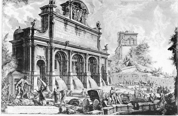 Editor: Here we have Giovanni Battista Piranesi's "Vedute di Roma," an etching capturing a Roman cityscape. The juxtaposition of crumbling ruins and everyday life is quite striking. What do you see in this print? Curator: This etching really highlights the material realities of Rome in Piranesi’s time. Look at the process he’s chosen: etching. It's a repeatable method, aligning with printmaking's purpose for wider circulation and, frankly, economic gain. He's selling these images to tourists, yes, but also contributing to a visual market, shaping ideas about Roman identity. The labor involved in the production of these prints, from the initial drawing to the etching process itself, points to a very different, working-class engagement with antiquity than we might find in more traditional painting. Editor: That's a great point about etching as a repeatable medium and the intention to distribute on a large scale. But what does that suggest about how Piranesi is regarding his subject matter? Curator: He’s challenging established hierarchies. He isn’t presenting some idealized vision of Rome accessible only to the elite. Through the mass production and circulation of prints, he's making Rome accessible to a broader audience and, moreover, implying that it exists in the everyday through labor and commerce rather than as simply an aestheticized ideal. And it's through his handling of line, texture, the physical act of etching, that he creates these gritty scenes of an actual lived-in, worked-in Rome. Editor: So he's blurring the lines between fine art and something closer to a commercial product. Curator: Exactly. This print isn't just about showing the beauty of Rome, but it’s intrinsically tied to the making and distribution of the artwork, thereby revealing an interest in labour. Editor: I never considered the economic aspects before, very interesting. Curator: The materiality is what brings it alive!