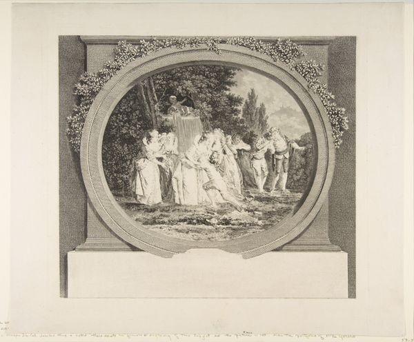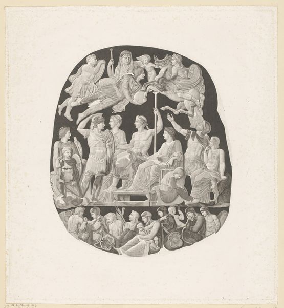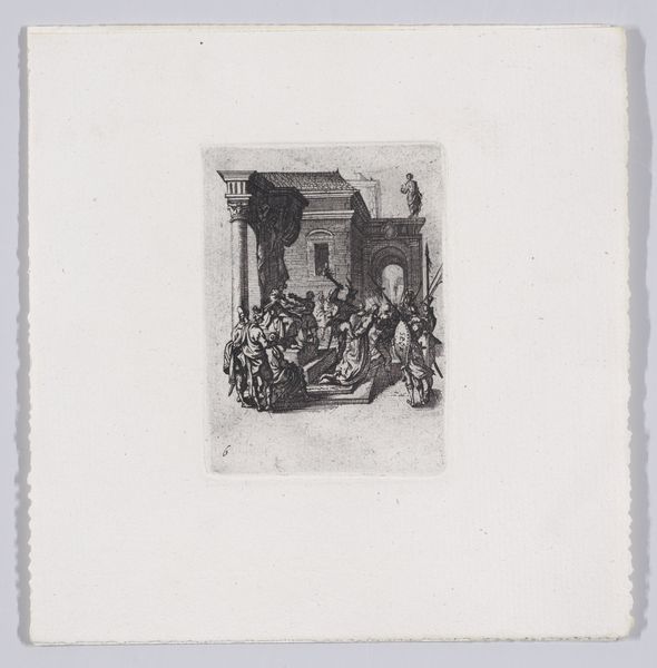 Curator: This print, executed sometime between 1851 and 1922, is entitled "Peter and John Healing the Paralytic at the Gate of the Temple," attributed to Tommaso di Lorenzo. It is done in an old engraving style and presents the biblical scene with a clear interest in Realism. What is your initial response to the image? Editor: It strikes me as quite powerful. Despite being black and white, the use of line and shadow evokes a solemn atmosphere. The classical architecture and the figures arranged almost like a frieze give it a sense of timelessness, and human drama. Curator: The choice to depict this event from the Acts of the Apostles is interesting in its own right. The story encapsulates early Christian values, doesn’t it? The public act of healing demonstrates the church’s emerging role in addressing social needs, providing tangible benefits, and establishing moral authority in first-century society. Editor: Precisely. It taps into a deep well of visual symbolism. The temple gate itself represents a point of access—both physical and spiritual. The lame man symbolizes those marginalized or excluded, physically or otherwise. His healing isn’t just a miracle; it’s symbolic of inclusion and transformation offered by the Christian faith. Curator: And we should note that it uses academic art's conventions in the image and that means that it speaks to a specific, educated audience, conveying social expectations around piety and civic responsibility prevalent in the 19th century. Art was integral to cultivating social mores. Editor: Absolutely. Look how the print emphasizes the apostles' gestures – their hands outstretched in a gesture of benevolence, almost conveying power or strength to those in need, echoing imagery seen for millennia and conveying something we all innately grasp regardless of creed. Curator: It really shows how an artwork created long ago continues to speak volumes to viewers, both by portraying a biblical event but also reflecting values that are more contemporary. Editor: Yes, that is definitely part of the artwork’s lasting power, I find. The story resonates across the ages because it encapsulates the timeless struggle against human suffering, a search for faith and salvation which many find beautiful.