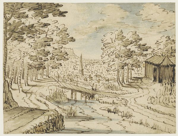 Curator: Here we have *View of a Country Road*, a print dating from 1559 to 1561, by Johannes or Lucas van Doetechum, residing here at the Rijksmuseum. Immediately, what catches your eye? Editor: There’s an odd starkness, even a bleakness despite being a natural scene. The composition, the linear, almost scratchy texture from the etching… it lacks a certain depth, wouldn't you say? Curator: Indeed. It calls to mind those traditional Northern Renaissance themes—rustic life, the working classes. This piece speaks to a common cultural idea about mankind coexisting with a specific notion of a 'domesticated' nature. Notice how those imposing trees frame that road? Editor: Yes, that is interesting. It is such an obvious choice compositionally: the framing creates an undeniable linearity. The artist guides us directly down the road, like directing the gaze, like enforcing meaning rather than letting it emerge. Is there an inherent psychological element within the road as metaphor? Curator: Quite possibly. A road inherently symbolizes journeys, destiny and the decisions impacting our lives. We often think of these figures wandering from somewhere toward a specific point—suggesting the allegorical notion of their limited perspective or place in the world. Perhaps there are hidden religious underpinnings in what feels like the landscape tradition coming into its own in Northern Europe. Editor: Yet the road doesn't so much invite as enforce the compositional lines as a flat perspective, where all objects inhabit a kind of foreground, a kind of tableau. Perhaps it shows an artist struggling with perspective itself, trying to wrestle nature into a system it resists? I see such tensions at play throughout this etching! Curator: Your points are astute. These elements can definitely seem awkward to a modern eye. Perhaps there is a commentary here of man trying to subdue or codify something inherently resistant and transcendent, if we view the natural world that way. Thanks to your close observations, this seemingly mundane country road actually takes us toward many interesting thematic perspectives. Editor: Indeed. Seeing this piece today makes you realize just how much our eye and mind processes when consuming any artistic visual object.