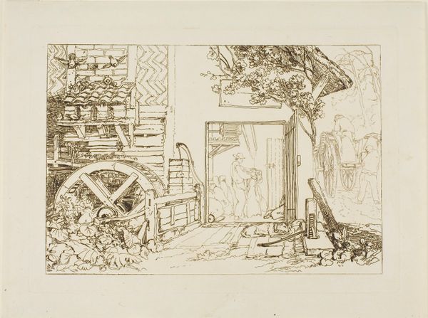 Editor: So, here we have Emmerik Høegh-Guldberg's 1831 satirical print, "Faust og Mefistofeles," etched in ink. There's this chaotic energy – figures mid-action, stuff scattered everywhere. What’s your read on it? Curator: Ah, chaos tamed! I see a witty wrestling match. The artist, I fancy, is tickling the very notion of power. Faust, often portrayed as seeking forbidden knowledge, looks rather...domesticated here. Don't you think that Mephistopheles, usually so imposing, seems almost…goofy? The devil's reduced to a bumbling figure. Is it making fun of authority, perhaps? Editor: It definitely clashes with the grand depictions of Faust I've seen. The devil usually has so much gravitas! This feels...different. I didn't expect the humour. Curator: Exactly! This isn't some fire-and-brimstone sermon. It's more of a sly wink. Imagine the artist chuckling to himself as he scratched those lines into the plate. Each object seems to hold a silent jab at societal norms, or maybe just poking fun at human nature's follies. Don’t you see it almost as caricature? Editor: It definitely does, now that you point it out. I love that contrast, how something so historically heavy is made so light! Curator: Yes, it’s that push-and-pull that breathes life into the piece! A reminder that even grand narratives can be wonderfully absurd, especially when looked through a satirical lens. Editor: Well, I'll definitely remember that next time I encounter a supposed 'masterpiece'. There's room for playful subversion! Curator: Precisely! Keep your eyes, and your mind, open! You never know where art will lead you when you embrace the unexpected.