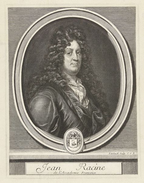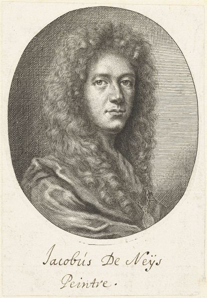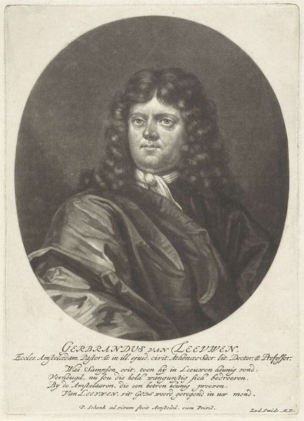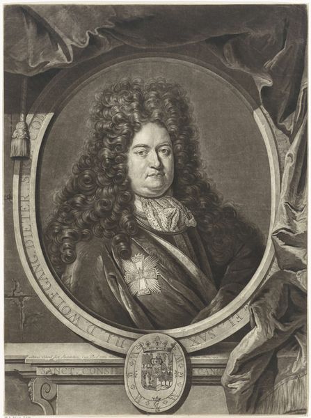 Editor: This is “Portret van Henricus Huls,” made sometime between 1670 and 1713 by Pieter Schenk. It’s an engraving. I find the stark contrast and tight composition make it seem quite formal. What catches your eye when you look at this portrait? Curator: Well, my first thought spirals back to the era, right? The Baroque! Think swirling drama, emotional intensity... and massive hair! Seriously, that wig is practically a character in itself. It speaks of status, importance, of wanting to dominate the visual space. Don’t you think that level of self-presentation says something about the period’s values? Editor: Absolutely! It’s like saying, "Look at me, I’ve got the time and resources for *this*." I wonder, though, if it's entirely about outward show? Do you see anything hinting at the inner character of the sitter? Curator: Good question! Beneath all the theatricality, there’s a certain directness in his gaze, wouldn't you agree? The inscription *Malis displicere* and *laudari a te* hints at someone concerned with authenticity, someone determined to be true to himself. The portrait as a whole presents the duality of existing within and slightly against a culture. How else would you describe this cultural push and pull? Editor: That makes me look at the artwork from a different angle. Curator: Exactly. Sometimes the most interesting things in art happen where intention and interpretation playfully diverge.