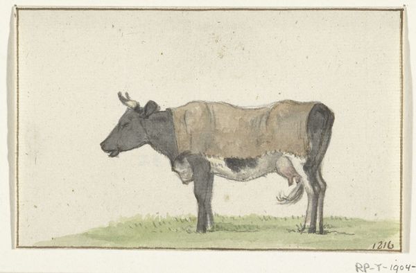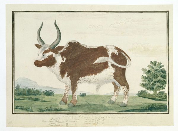 Robert Jacob Gordon created this drawing, "Bos taurus: Cape Ox," using pen, ink, and watercolour. The composition immediately directs us to the ox, centrally positioned against a backdrop of fields, bushes, and distant mountains under a cloudy sky. The colour palette here is muted, almost monochromatic. Varying tones of grey subtly define the form of the ox, while pastel greens and blues suggest the landscape, creating an overall sense of quiet observation. Gordon’s meticulous attention to detail in the musculature and bone structure of the ox provides an analytical, almost scientific quality to the artwork. Yet, by placing this specimen within a landscape, Gordon invites us to consider the ox not merely as an object of study but also as an integrated element of its environment. How does this interplay between scientific scrutiny and environmental awareness affect our understanding of nature? This combination prompts us to think about the changing perceptions of the natural world during the Enlightenment. The ox, carefully rendered, stands as both a subject of scientific interest and a symbol of its ecological context.