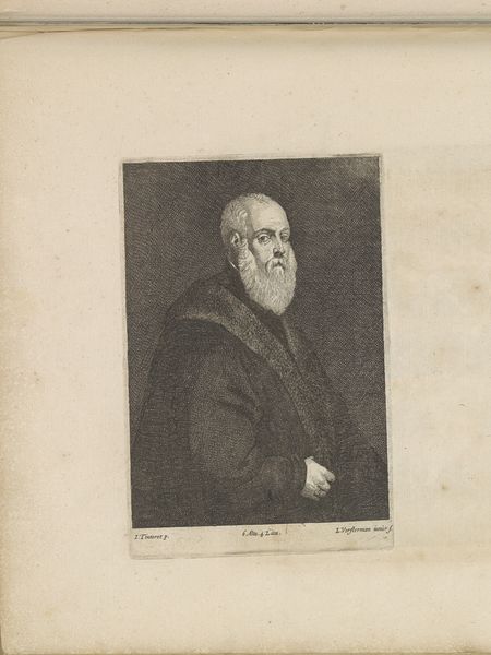 Lucas Vorsterman the Younger created this portrait of Titian using engraving techniques, capturing a sense of gravitas through form and structure. Notice the intricate cross-hatching that defines the dark tones of Titian's fur-lined cloak and cap, setting off the stark white of his collar and beard. The artist's gaze is directed out and slightly upwards, suggesting both a visionary intellect and perhaps a degree of detachment. Vorsterman's use of line is particularly effective, creating textures that invite the eye to explore the depth of the image. The portrait's structure invites a semiotic reading: the dark areas could represent the weight of experience, while the lighter tones illuminate Titian's face, symbolizing enlightenment. In its careful arrangement of light and shadow, the work embodies a tension between inner reflection and outward expression, creating a complex interplay of signs that engage with prevailing humanist values. Ultimately, this engraving exemplifies how formal elements can construct not just an image, but also a discourse about identity, intellect, and artistic legacy.