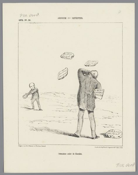This political print was made by Johan Michaël Schmidt Crans in 1861, using a technique called etching. This involves drawing an image into a waxy ground on a metal plate, then using acid to bite away the exposed lines, creating an image that can be inked and printed. Note the contrast between the clean lines of the figure, representing the departing minister F.A. van Hall, and the more chaotic, scribbled lines of the landscape. This contrast not only creates visual interest but also mirrors the political turmoil of the time. Etching allowed for the relatively quick production of images. This was important for political cartoons, which needed to be timely to be effective. The very process of etching, with its reliance on chemical reactions and mechanical reproduction, speaks to the industrializing world in which this image was made. Consider how the choice of materials and techniques is crucial to its meaning and impact. By understanding the making, we gain deeper insight into the social and political context of the work.