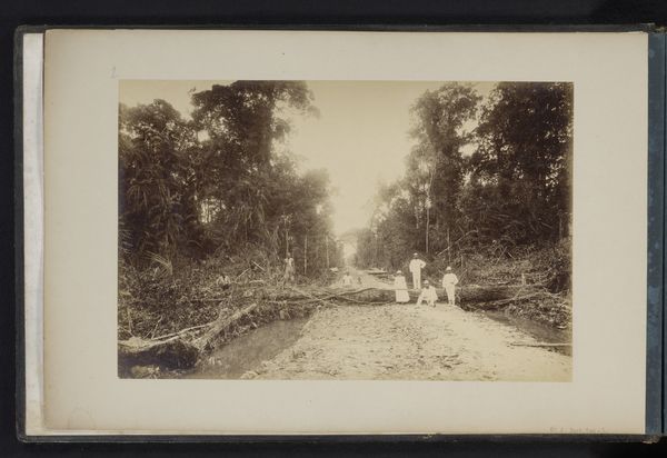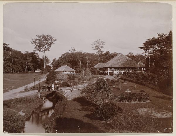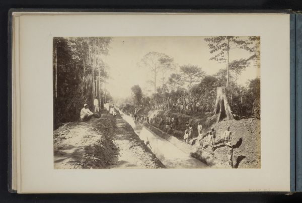 This photograph titled, "Kanaal op de Stabat plantage, Sumatra" was created by Heinrich Ernst & Co. The image captures a canal within the Stabat plantation in Sumatra, and its placid surface reflects both the sky and the surrounding vegetation. On the bank, a cluster of figures, presumably plantation workers, stand alongside modest dwellings, providing a glimpse into their living conditions and social structures within this colonial enterprise. This image offers a window into the complex dynamics of colonialism, reflecting the exploitation of land and labor, while raising questions about the identities and lived experiences of those who were part of this system. The photograph invites reflection on the human cost of economic and imperial expansion. Though seemingly a tranquil scene, "Kanaal op de Stabat plantage, Sumatra" encapsulates a narrative of power, labor, and the shaping of landscapes by colonial forces. The photograph serves as a poignant reminder of the interwoven histories that continue to shape our world.