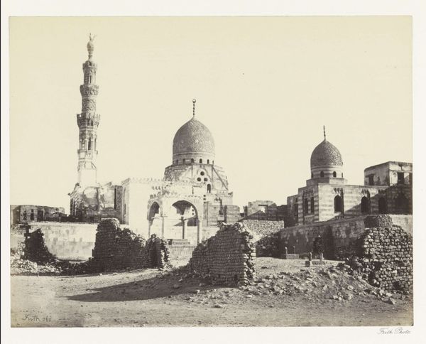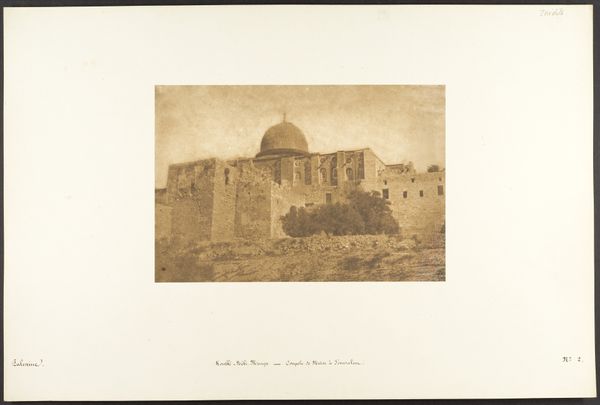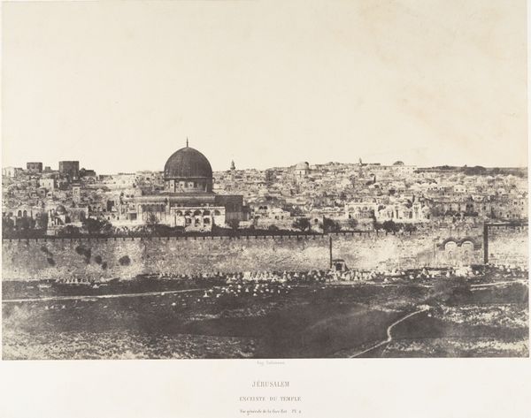 Editor: So, this is Auguste Salzmann’s photograph, "Jerusalem, Saint-Sépulcre, Vue Générale, 1," taken between 1854 and 1859. It’s a daguerreotype, giving it this incredible, almost ghostly level of detail. It feels incredibly…stark, almost severe. What do you see in this piece? Curator: Beyond the surface, this image echoes a visual language deeply rooted in religious symbolism. The Church of the Holy Sepulchre itself, captured here, stands as a powerful nexus – representing both the crucifixion and resurrection. Salzmann, I think, understood the inherent symbolic weight of Jerusalem itself. Don’t you find it interesting that he chose this particular vantage point? Editor: You mean how it emphasizes the architecture and almost dwarfs the figures outside the wall? Curator: Exactly. The architecture becomes a symbol in itself – of enduring faith and resilience through centuries of conflict. Note the contrast between the solidity of the stone and the ephemeral nature of the figures. Does that tell us something about the photographer’s intent? Perhaps to show faith's power over mortality? Editor: I hadn’t thought about it like that. The figures almost seem incidental, yet their presence anchors the photograph to a specific moment in time. Curator: And that’s precisely the tension at play here, isn't it? It invites contemplation about permanence versus the transient. Considering the rise of photography during this era, the very act of capturing this image became a statement about preserving history, memory, and belief for the future. Editor: It's fascinating how much depth a single photograph can hold, and how viewing it through the lens of symbolism unlocks those deeper meanings. Thank you for sharing your insights. Curator: It's been my pleasure. Looking at art together helps us both notice what the artwork whispers to us, something easily missed on our own.