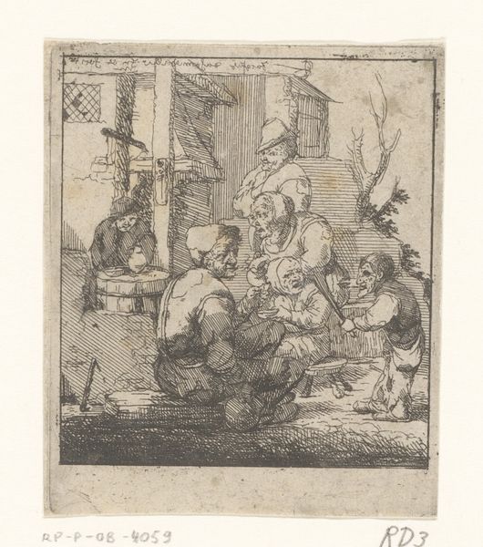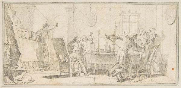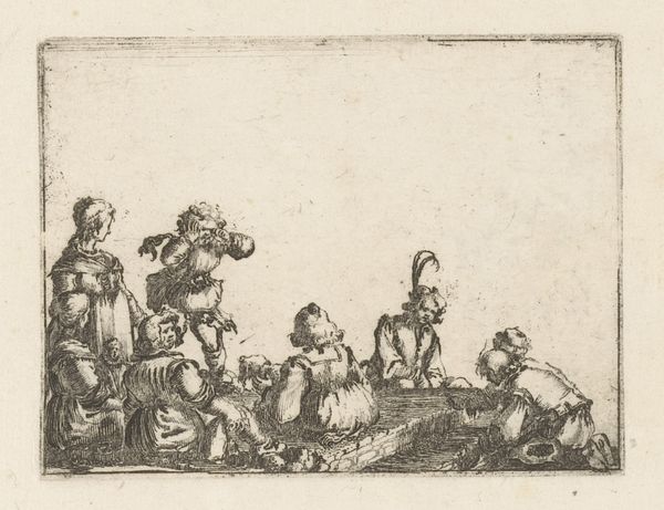 Curator: We are standing before "Vrolijk gezelschap aan tafel in de open lucht," a 17th-century drawing attributed to Willem Pietersz. Buytewech, housed here at the Rijksmuseum. It's rendered in pen and ink. Editor: It’s surprisingly vibrant for such limited media. The whole composition seems bursting with movement, albeit sketched – there's a delightful energy. Curator: Absolutely. Buytewech captures a moment of lively leisure, quite typical of Dutch Golden Age genre painting. One sees how these scenes reflect the emerging merchant class, asserting its new social status through depictions of…well, convivial gatherings. Editor: It is all about power and image projection then? The attire, the implied wealth with that elaborate architectural setting – it all performs affluence. But let us look more closely: Observe the angles. The artist sets up this series of diagonals through posture and arrangement. And, also, that tension between positive and negative space. So skillfully done in the negative space within figures that lets our eye fill in the picture even if it's unfinished! Curator: Very insightful! And indeed the contrast created is interesting, isn't it? Notice how the controlled penwork defines form, yet simultaneously allows the scene to breathe? This creates visual depth. Also the repetition of curved lines such as collars and arches and posture bring the overall sketch to some level of unity Editor: I do also enjoy noticing these characters that are partially sketched! Their ambiguity emphasizes the ephemeral nature of social moments... What is so lasting about one good time that makes us wanna capture it? Curator: Exactly. Art then also acts as a witness of change of morals. What kind of themes or details do you notice? Editor: What strikes me is that in the way people were portrayed there seems a sense of freedom… the gestures, some relaxed body positions! Is it like everyone got to unleash! And maybe celebrate the power or life or themselves… a group pride feeling Curator: That certainly aligns with the broader cultural shifts happening then. This piece is very compelling because it marries masterful technical skill with this fascinating historical context of burgeoning Dutch prosperity and the shifting sands of social dynamics. Editor: Indeed. Buytewech really encapsulated that feeling, didn't he? I will have another walk!
