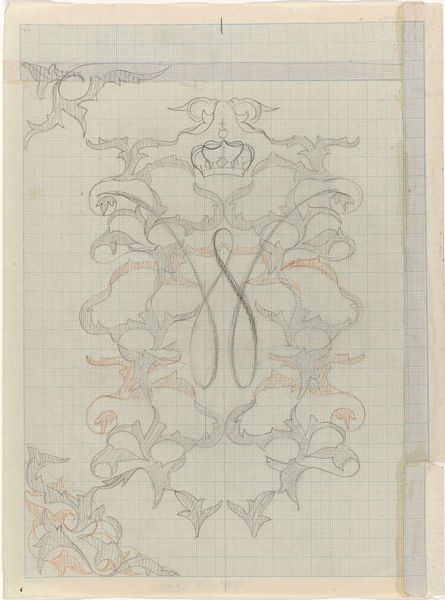Curator: What catches my eye immediately is this…dreamy quality. Like looking at something through fog. Editor: That's a fitting impression. What we have here is a design study, rendered in pencil on aged, almost tea-stained paper, titled "Decoratief ontwerp met een dier." It’s from the period of 1874 to 1945 and comes to us from Carel Adolph Lion Cachet. It feels like a fragment from a much larger ambition. Curator: Absolutely. The grid beneath the drawing gives it a strangely technical vibe against those swirling, organic shapes. A little beastie hovers in the middle! It’s as if he’s caught between worlds. Did Lion Cachet usually do preparatory work on graph paper? Editor: Not always, but the use of grid paper is definitely visible across the artist's journals, where one can find examples of architectural blueprints for structures designed in oriental style or art nouveau typeface lettering. The tension you sensed – between the technical and the fanciful – probably stemmed from Cachet's professional career, where as interior and graphic designer, he aimed at harmonizing modern life with more old-fashioned taste for ornamentation. Curator: It makes you think about what designs become, right? The ideas that make it to the grand ballroom and those that languish in the sketchbook. Do you think this critter would have stood a chance? Editor: Considering Cachet designed many opulent interiors on the service of ship companies during his later years, I would say it could. There are certainly precedents of stylized deer or gazelle incorporated to the larger composition. In looking closely at how the decorative form and creature’s pose share in equal parts naturalistic curves and geometric stylization, this draft probably could find its place in Art-Deco themed environments of early 20th century. But that's, of course, just speculation. Curator: It makes me appreciate even more the vulnerability of it, here on paper, decades after being drawn. An echo of creativity. Editor: Perhaps that's the magic of design drawings: potential, pregnant with futures both realized and unrealized. The ghost of what could be. Curator: Beautifully put! It's pieces like this, seemingly minor, that can open up entire avenues of thinking. Thank you.