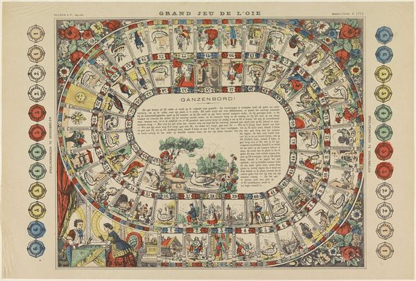 Hendrik Moolenyzer's "Historisch spel van Waterloo" is a board game, printed on paper, inviting us to reflect on a pivotal moment in European history. The game's design is relatively simple, likely achieved through techniques such as etching or engraving, common for reproducing images at the time. The graphic details and typography are carefully rendered, showing a level of skill that speaks to the craft of printmaking as a commercial enterprise, intended for a growing middle class with more access to leisure. The aesthetic choices – the numbered spaces, the central image of leaders, and the decorative border – all contribute to the game's function. But they also subtly reflect the social values of the period, idealizing historical events as a form of entertainment. Looking at it this way, we can understand this board game not only as a source of amusement, but as a material object deeply embedded in its own time, reflecting industrial production, emerging consumer culture, and the social importance of the events it represents.